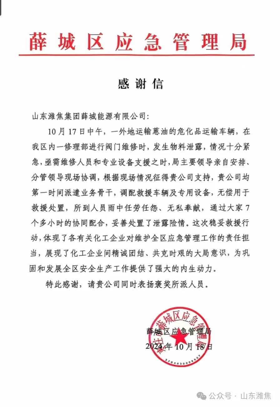 10月17日中午,一外地運(yùn)輸蒽油的危化品運(yùn)輸車輛,在薛城區(qū)一車輛修理部進(jìn)行閥門維修時(shí),突發(fā)危化品物料泄漏事故,情況十分緊急,薛城能源公司接訊后,派遣業(yè)務(wù)骨干,調(diào)配救援車輛及專用設(shè)備,無償用于救援處置。參加救援人員冒雨操作,任勞任怨、無私奉獻(xiàn),經(jīng)過7個(gè)多小時(shí)的協(xié)同配合、緊急救援,?;沸孤╇U(xiǎn)情成功妥善處置。